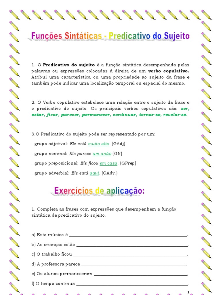 WebAtividade, exercícios sobre sujeito, predicado e tipos de sujeitos para o 7º ano ou 8º ano. Você pode baixar esta atividade em PDF no final, pronta para impressão. Leia. Web(Manoel de Barros) a) Que verso do poema indica o momento de alegria do eu lírico? b) Qual verso ilustra quando a comunicação não era bem sucedida? c) Que verso transmite. WebConfira abaixo 23 exercícios de sujeito e predicado para testar seus conhecimentos sobre esse assunto. Lembrando que o sujeito é aquele ou aquilo de que(m) se fala. Já o. WebA oração é um conjunto de palavras formado pelo sujeito e o predicado. Analisando outras orações compreenderemos que: Paulo foi o artilheiro do campeonato mirim. Sujeito . Web3 planos de aula sobre Estrutura da oração: sujeito, verbo, objeto Material para trabalhar as habilidades: EF07LP07 : Identificar, em textos lidos ou de produção própria, a estrutura. WebATIVIDADES: SUJEITO, PREDICADO, VERBO DE LIGAÇÃO, ADVÉRBIO. 1. Você aprendeu que o sujeito é o termo da oração que informa de que ou de quem se fala e.