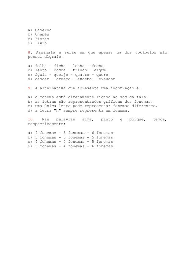 WebCom estes exercícios sobre fonemas, você pode avaliar seus conhecimentos em Fonologia da Língua Portuguesa. Publicado por: Luciana Kuchenbecker Araújo. Imprimir. Questão. WebQual as palavra que possui 5 Fonemas : Ficha - 5letras . F/I/CH/A = 4 fonemas. CH um só som . Molhado - 7 letras . M/O/LH/A/D/O = 6 fonemas. LH um só som . Guerra - 6 letras .. Webb-( ) 5 fonemas - 5 fonemas - 5 fonemas. 06) A alternativa que apresenta uma incorreção é: e-( ) A letra "h" sempre representa um fonema. 07) O vocábulo cujo. WebIndique a palavra que tem 5 fonemas. A)fechado b)rolha c)seguinte d)flecha e)missa 2 ver respostas michelleolivei1 michelleolivei1 d) flecha : Indique a palavra que tem 5. WebLetras e Fonemas são conceitos importantíssimos da língua portuguesa. As Letras são as representações gráficas enquanto os Fonemas são as representações sonoras. Para. WebAlguns fonemas consonantais têm uma letra ou duas que os representem com exclusividade. É que, na palavra, caminho, por exemplo, o som "nh" é representado. Web1. A palavra que apresenta tantos fonemas quantas são as letras que a compõem é: a) importância b) milhares c) sequer d) técnica e) adolescente 2. Em qual das palavras. WebFonemas são os sons que representam cada uma das letras - os sinais gráficos da nossa língua, ou seja, os fonemas são unidades sonoras. Por exemplo, a palavra fixoé.