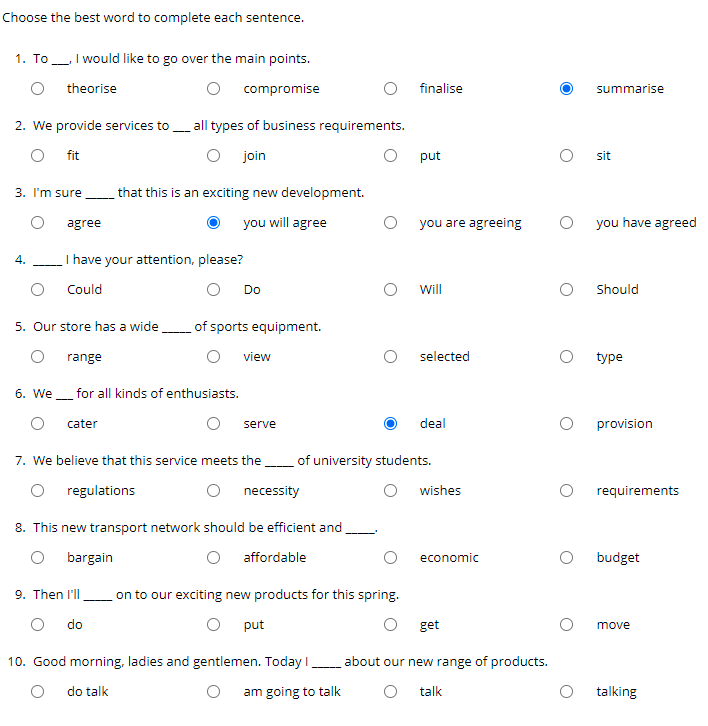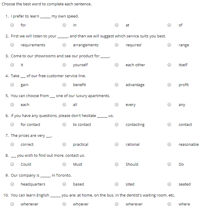WebChoose the best option to complete the sentences. by Analia Uhlig. 20 plays. 8 questions. ~20 sec. English. 0. too few (you: not rated) Tries. WebChoose the best option to complete the sentence or conversation - Easy Language Exchange. Working together Category: Questions Choose the best option to. Web4) Choose the best option to complete the sentences. (Escoja la mejor opción para completar las oraciones) 1. An energetic, aggressive, influential person is who is not.