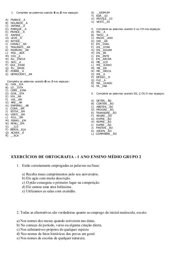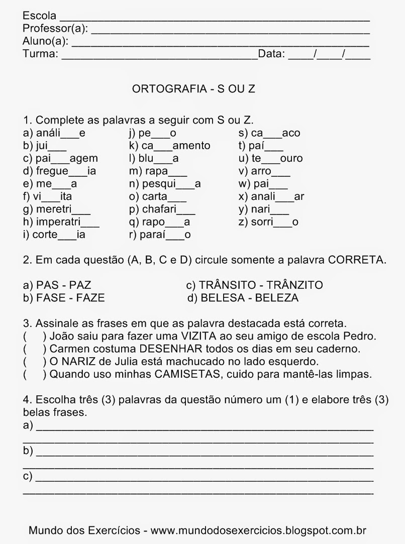 WebSouza / Souza (trata-se de nome próprio, permitindo as duas opções) É muito comum, na língua portuguesa, nos confundirmos quanto ao uso de "S" ou "Z", tendo. WebARMAZÉM DE TEXTO: ATIVIDADES DE ORTOGRAFIA - COM GABARITO. 01 Complete as palavras usando S ou Z nos espaços: A) FRANCESA. WebSÉTIMO ANO - LÍNGUA PORTUGUESA. 1. Complete as palavras usando S ou Z nos espaços: 2. Complete as palavras usando G ou J nos espaços: 3. Complete as.