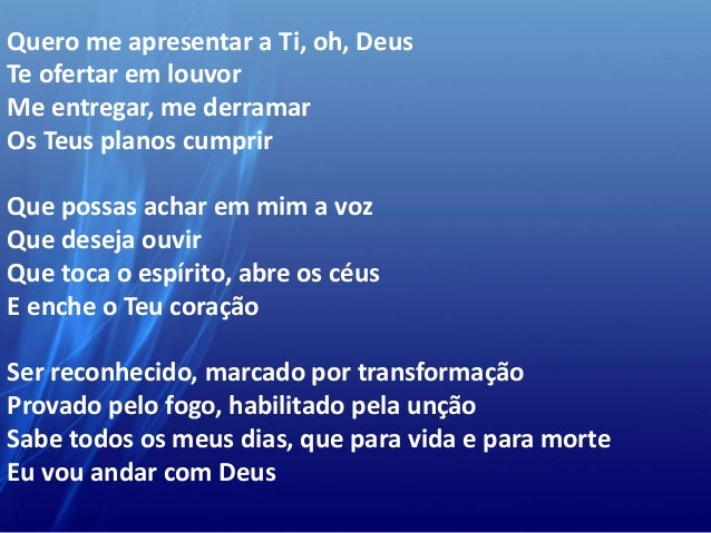 WebAbout Press Copyright Contact us Creators Advertise Developers Terms Privacy Policy & Safety How YouTube works Test new features Press Copyright Contact us Creators ... WebDeus Te ofertar em louvor me entregar, me derramar Os teus planos cumprir. Que possas achar em mim a voz que deseja ouvir que toca o espirito, abre os céus e enche o teu. WebSer Reconhecido Por Deus. Composição de (Bpa. Sonia / Denise Bittencourt / Felipe Cruz) F#m. Violão & Guitarra. ( Intro 4x) F#m A D F#m A E F#m Quero me apresentar a. WebSer Reconhecido Play Black Baixar , buscar e ouvir musicas em mp3 gratuitamente com nosso buscador Ser Reconhecido Play Black Baixar Musicas MP3 Ser Reconhecido Por. WebQuero me apresentar a Ti, ó Deus Te ofertar em louvor Me entregar, me derramar Os Teus planos cumprir. Que possas achar em mim a voz Que deseja ouvir Que toca o Espírito,. WebSer reconhecido, marcado por transformação. Aprovado pelo fogo, habilitado pela unção. Sabe todos os meus dias. Que pra vida e para morte, eu vou andar com Deus. O Senhor. WebQue toca o espírito, abre os céus. E enche o teu coração. Ser reconhecido, marcado por transformação. Aprovado pelo fogo, habilitado pela unção. Sabe todos os meus dias, que. WebSó Tua graça me basta. E Tua presença é o meu prazer. Eu não preciso ser reconhecido por ninguém. A minha glória é fazer com que conheçam a Ti. E que diminua eu pra que. WebSer Conhecido De Deus Renascer Praise. Quero me apresentar a ti, oh Deus Te ofertar em louvor Me entregar, me derramar Os teus planos cumprir Que possas achar em mim a.