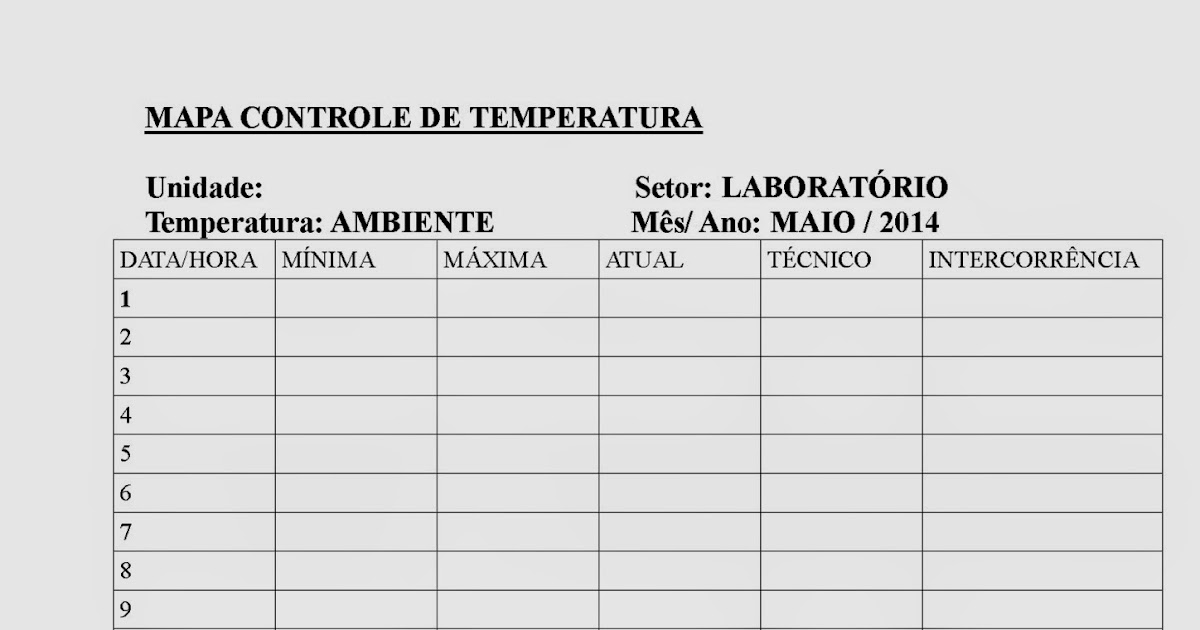 WebPré-visualização parcial do texto. Baixe Modelo planilha temperatura e outras Manuais, Projetos, Pesquisas em PDF para Farmácia, somente na Docsity! T.mín: 15ºC | T. máx:. WebAs especificações de temperatura permitidas devem ser preenchidas de acordo com o intervalo de variação de temperatura estipulado para o equipamento. Para efetuar o. Webcontrole de temperatura das geladeiras em bancos de leite e integra o Controle de Qualidade em Bancos de Leite Humano. 2. Documentos Complementares Na. Web1 Controle de Temperatura ON/OFF Um outro exemplo comum de controle ON/OFF é um termostato doméstico de uma geladeira por exemplo. Quando a. WebAuxiliar de farmácia Os passos para verificação das temperaturas atual, mínima e máxima ambiente estão descritos a seguir: 1. Anotar a data e horário da verificação na planilha. WebA temperatura ambiente deve permanecer entre 18°C e 22°C. Ajustar a temperatura no condicionador de ar, usando o controle remoto, se a temperatura não se mantiver nesta. WebBaixe agora o ?? EBOOK GRATUITO: Como Realizar uma Capacitação Efetiva para Manipuladores de Alimentos???? http://vidadeconsultoria.com.br/ebook_____... Web1. Anotar a data e horário da verificação na planilha de controle da temperatura ambiente. 2. Verificar a temperatura atual no termômetro e registrar, utilizando a temperatura indicada.