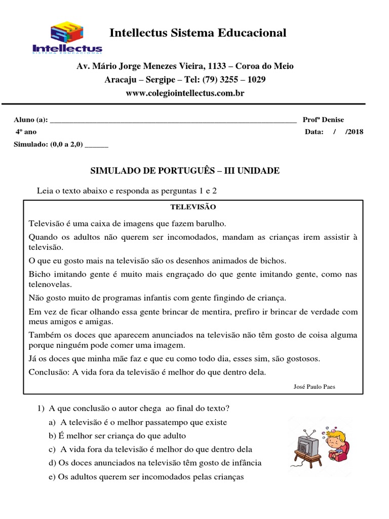 Weba) Em - Olha s o que eu vou fazer, doutor!, temos : ( ) discurso direto ( ) discurso indireto. b) Passe esse discurso para o outro tipo, fazendo as alteraes necessrias. 2). WebSalvar Salvar ficha discurso indireto e direto 6º ano para ler mais tarde. 0% 0% acharam este documento útil, Marcar esse documento como útil. 100% 100% acharam que esse. WebPara diferenciar discurso direto e indireto, basta compreender que o indireto não permite a fala do personagem, já que todas elas são apresentadas pelo narrador. Os exercícios. WebE.E. José Alexandre Miziara Atividades de Língua Portuguesa Discurso direto e discurso indireto Para cada tirinha em quadrinhos, a proposta é a seguinte: a) Você vai. WebDiscurso direto; Discurso indireto; e; Discurso indireto livre. Os diferentes tipos de discurso são empregados, nas produções do gênero narrativo, para introduzir os. WebDiscurso Indireto Livre. No discurso indireto livre há uma fusão dos tipos de discurso (direto e indireto), ou seja, há intervenções do narrador bem como da fala dos personagens.. WebTransformamos discurso indireto em discurso direto. Faça o mesmo. a) Com as mãos trêmulas, ela pediu que a ajudassem. _____ _____ b) A professora gritou que. WebA) discurso direto b) discurso indireto 5) não gosto das aulas remotas, disse ela, torcendo pelo retorno das aulas presenciais. A) discurso direto b) discurso indireto 7) o aluno disse. Weba) No discurso indireto, o narrador utiliza suas próprias palavras para reproduzir a fala de um personagem. b) O narrador é o porta-voz das falas e dos pensamentos das.