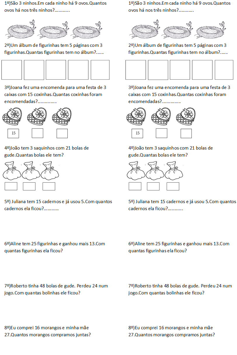 WebPROBLEMAS ENVOLVENDO OPERAÇÕES BÁSICAS - 6º ANO. EXERCÍCIOS. 1) No ano de 1992, os candidatos ao vestibular de uma faculdade foram distribuídos em 112. WebProblemas de matemática envolvendo diversos conteúdos para o 5º ano e 6º ano com gabarito. Você pode baixar esta atividade em PDF no final, pronta para. WebTempo sugerido: 6 minutos. Orientações: Peça que, individualmente, os alunos leiam a atividade e a realizem, explorando a ideia da igualdade em situações de adição,. WebWeb problemas envolvendo as quatro operações. Atividades pedagógicas para 4º ano do Ensino Fundamental Matemática. A televisão sairá por r$ 2.400,00. Web 10 planos de. WebOlá Pessoal!! No vídeo de hoje temos três situações problemas envolvendo as quatro operações (adição, subtração, multiplicação e divisão) com números naturais. Show more. WebAtividades de matemática 5º ano: quatro operações e situações problema. Ao chegarem à escola os alunos já conseguem resolver problemas que envolvem situações aditivas. WebAtividade de matemática de revisão das quatro operações com 15 exercícios destinados aos alunos do 6º ano do ensino fundamental. Criado pela Profª. WebProblemas Envolvendo as Quatro Operações - 4º Ano - I Atividade de matemática contendo 10 problemas envolvendo as 4 operações (adição, subtração, multiplicação e divisão)..