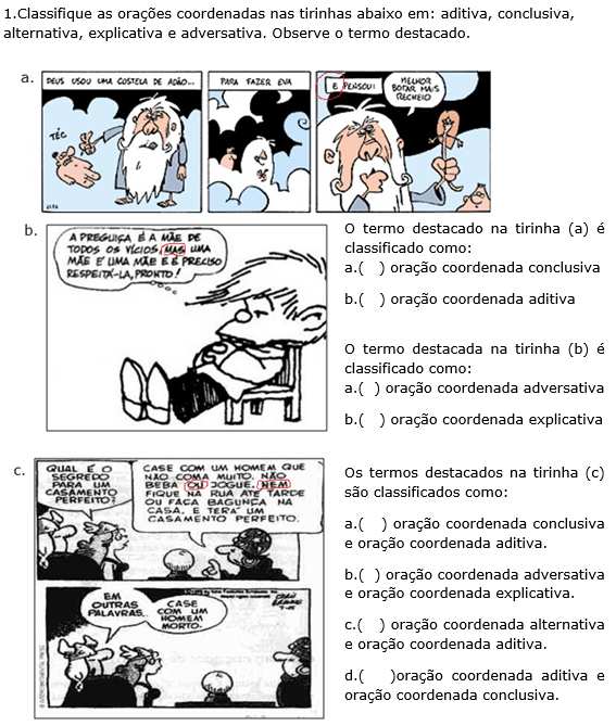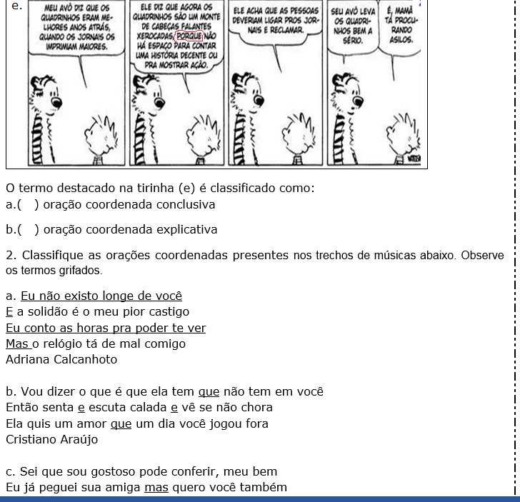 Web4-Classifique as orações coordenadas sublinhadas conforme o código abaixo: ( 1 ) oração coordenada assindética ( 2 ) oração coordenada sindética aditiva ( 3 ) oração. WebOs exercícios deste gabarito está aqui. Classifique as orações coordenadas sublinhadas conforme o código abaixo: A) gosto muito de dançar, pois faço jazzdesde pequenina. (. WebConjunções Coordenativas. 1) Destaque e classifique as conjunções coordenativas abaixo: a) Gosto muito de dançar, pois faço jazz desde pequenina. b) Recebeu a bola,. WebClique aqui ?? para ter uma resposta para sua pergunta ? Gosto muito de dançar,pois faço "jazz" desde pequenina.Qual é o tipo de conjunção explicativa ou. Weba) Gosto muito de dançar, POIS FAÇO JAZZ DESDE PEQUENINA. (5) oração coordenada sindética explicativa. b) Recebeu o presente, abriu o pacote E. Web(5) Gosto de dançar porque pratico jazz desde criança. (2) Receba o presente, abra-o e sorria brilhantemente. (2) Acendi a lâmpada, tirei a cortina e me deitei.. WebGosto muito de dançar, pois faço "jazz" desde pequenina. 2. Recebeu a bola, driblou o adversário e chutou para o gol. 3. Acendeu o abajur, guardou os. Weblamentável demonstração de irresponsabilidade e ignorando os avanços conquistados pela sociedade brasileira, aprovou um projeto de lei que revoga o Estatuto. Webi- Gosto muito de dançar, pois faço jazzdesde pequenina. j- Recebeu o presente, abriu o pacote e soltou um largo sorriso. k- Acendeu o abat-jour, guardou os.