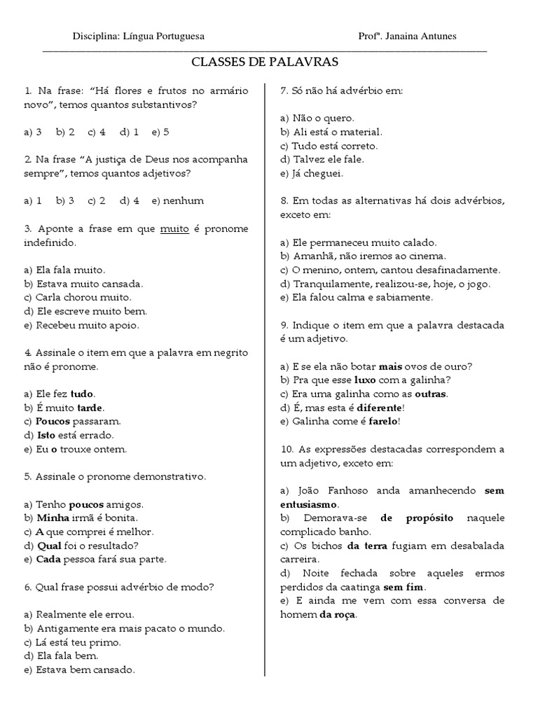 WebExerccios Classe Gramatical. 1) Localize os substantivos que aparecem nas oraes abaixo: a) As pessoas estavam muito contentes na festa. b) Todas as crianas parecem. WebPágina com exercícios de Português para o 7º Ano. São exercícios de escolha múltipla com correção imediata, de forma a que se perceba logo qual foi o erro, se tiver havido. WebOs 9 exercicios sobre classes gramaticais com gabarito. Classes gramaticais são os conjuntos que classificam as palavras. Sendo divididas em dez tipos.