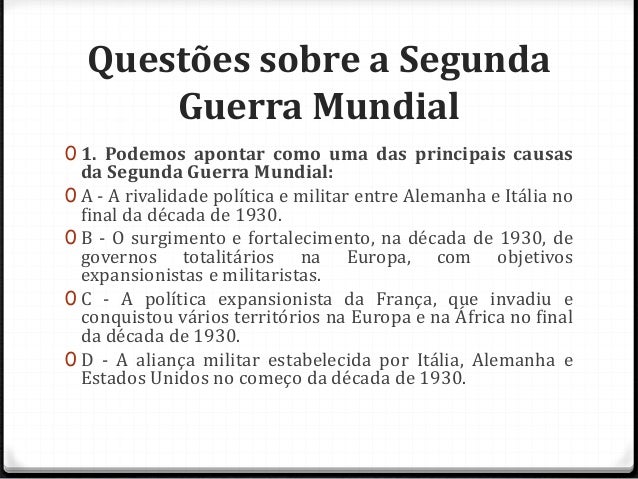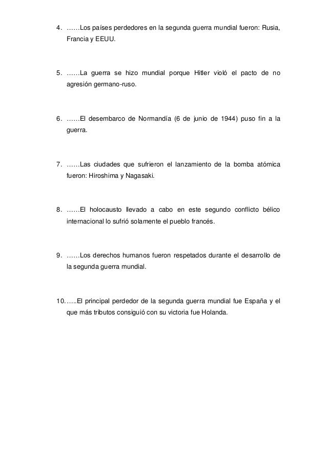 WebSegunda Guerra Mundial - XXVI. Este quiz desafia os conhecimentos sobre a Segunda Guerra Mundial. Começando pela invasão da Polônia e passando por muito outros. WebAño en que inicia la segunda guerra mundial R.- 1939 4.- Año en que termina la segunda guerra mundial R.- 1945 5.- ¿Donde nace el partido Nazi? R.- Alemania 6.-. WebEm que dia acabou oficialmente a Segunda Guerra Mundial? 7 de maio de 1945. 8 de maio de 1945. 9 de maio de 1945. 11 de maio de 1945. Como se chamavam. WebPATREON: https://bit.ly/39Ch3jkYA SOMOS 300.000 MUCHAS GRACIAS A TODO. Y para celebrarlo os he preparado un quiz con 25 preguntas sobre la Segunda. WebCuestionario GK sobre la Segunda Guerra Mundial: La Segunda Guerra Mundial, también conocida como Segunda Guerra Mundial. Duró de 1939 a 1945 y en. WebEste quiz desafia os conhecimentos sobre a Segunda Guerra Mundial. Começando pela invasão da Polônia e passando por muito outros tópicos como as ambições japonesas. WebCUESTIONARIO SOBRE LA SEGUNDA GUERRA MUNDIAL. 1. ¿En qué año accedió Hitler y el partido nacional-socialista al poder? el 30 de enero de 1993. 2. ¿Qué sucesos. WebPreguntas sobre la Segunda Guerra Mundial Tema 7 del libro. 1 - Las causas y el detonante de la guerra. Define: a. Eje Berlín-Roma: Las relaciones entre Alemania e.