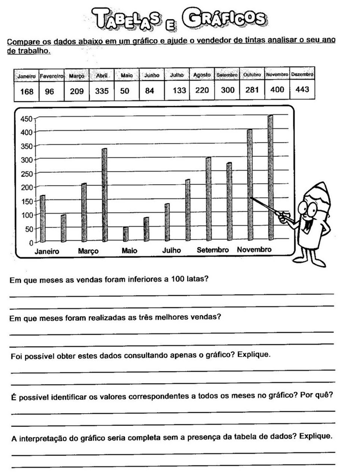 Webnou às 18 horas e 23 minutos. Qual foi o tempo de gravação? a) 48 minutos. b) 72 minutos. c) 78 minutos. d) 93 minutos. 12. Na semana cultural da escola uma partida. Webwww2.bauru.sp.gov.br WebO Gráfico I mostra o número de atendimentos realizados pelos funcionários A e B, durante 2 horas e meia, e o Gráfico II mostra o número de atendimentos. WebGráficos são representações visuais que visam exibir dados. Geralmente, são utilizados para demonstrar tendências, padrões e comparar informações qualitativas. WebAtividades com gráficos 4o ano para imprimir. Home; Português; Geografia; Ciências; Inglês; Caligrafia; Educação Infantil ; Concurso Público; Atividades de. WebESTATÍSTICA E PROBABILIDADE O que são Gráficos ? Gráficos são representações visuais utilizadas para exibir dados, sejam eles, sobre determinada informação, ou. Webdestrutivos e causar danos em um raio de cem quilômetros do epicentro. Entre 7,0 e 7,9, causam danos sérios em áreas maiores; e de 8,0 em diante são destrutivos por um raio. WebEssa atividade é para alunos que estão aprendendo sobre gráficos e tabelas. O aluno deve completar a tabela e responder algumas perguntas, interpretação de tabelas. Em. WebO aluno que marca a alternativa b, d ou e inverte um dos valores encontrados, demonstrando falta de atenção quanto ao pedido. O aluno que marca a alternativa c ou e.