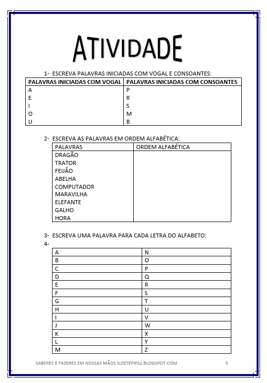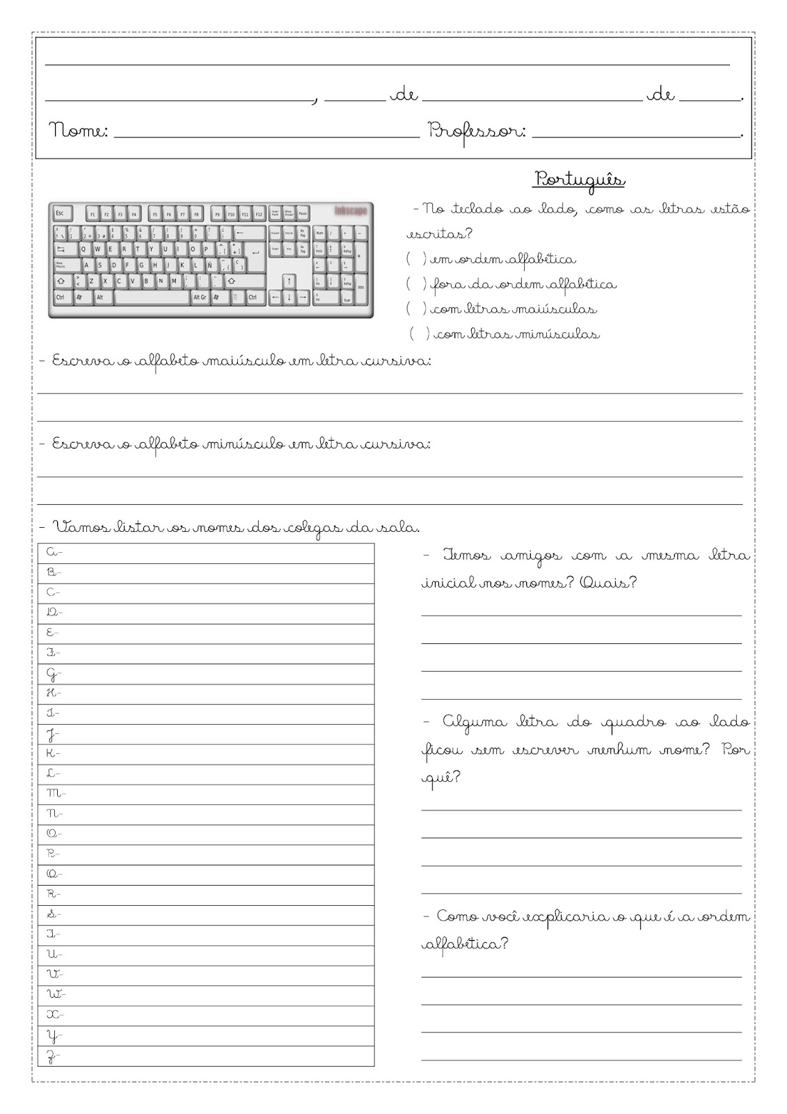 WebAtividades de alfabetização. O Toda Matéria preparou um conjunto de tarefas destinadas a alunos em fase de alfabetização, que inclui caça-palavras, cruzadinha, atividades de. WebAmigos e amigas do Sosprofessoratividades.com, à primeira vista, o objetivo da atividade O nosso alfabeto é fixar o conceito de ordem alfabética já adquirido. WebAtividades com Ordem Alfabética Para Imprimir Confira algumas atividades com ordem alfabética para imprimir, são atividades educativas pra ajudar os professors. WebAtividade Produção De Texto. Linguagem Oral E Escrita. Fichas para trabajar la expresión escrita, escribe historias sobre tus vacaciones, describe dibujos o completa frases.. WebB ( ) Pode ser entendida como sendo um aparelho, uma atividade não prática, um processo que contribui para o alcance de objetivos. C ( ) Visar encontrar problemas para os. WebB) açúcar banana limão - canela cravo. C) canela cravo limão - açúcar banana. D) açúcar banana canela cravo - limão. 2) Leia o texto. (...) A.