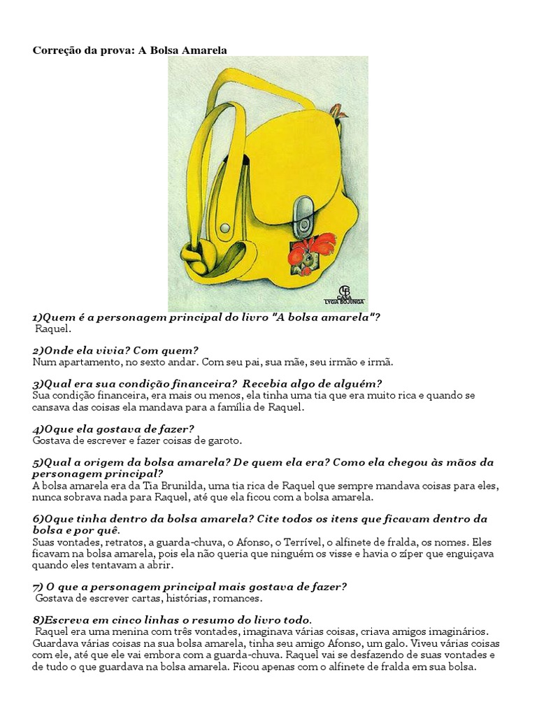 WebO livro a bolsa amarela, escrito por lygia bojunga nunes, e conta a história de raquel, uma garota que possui três desejos simples: ( ) para raquel, comprar um sapato novo e tomar. WebO livro "A bolsa amarela", escrito por Lygia Bojunga Nunes, e conta a história de Raquel, uma garota que possui três desejos simples: Ser menino; Ser adulta; Ser. WebResumo. Trata de uma breve análise literária do livro A Bolsa Amarela de Lygia Bojunga, a fim de identificar os pontos de encontro dessa obra com a crítica literária. WebA BOLSA AMARELA é o romance de uma menina que entra em conflito consigo mesma e com a família ao reprimir três grandes vontades (que ela esconde numa bolsa amarela) -. WebAcabou virando um galo tomador-de-conta-de-galinha. ( ) Para Raquel, comprar um sapato novo e tomar um sorvete eram vontades pequenas. ( ) Os primeiros textos que a menina. WebVersão em PDF. Quer salvar o resumo deste livro em PDF? Simples, clique no botão abaixo e salve o arquivo em seu computador. Lembrando que você pode distribuir este. WebA Bolsa Amarela já se tornou um \"clássico\" da literatura infanto-juvenil. É o romance de uma menina que entra em conflito consigo mesma e com a família ao reprimir três. WebA Bolsa Amarela Esse livro fala sobre uma menina chamada Raquel que tem vontade de ser grande, de ser menino e se tornar escritora. Só que sua familia não. WebEsse livro é uma reflexão sobre as regras impostas em nossa sociedade, onde menino pode, menina não. Onde adulto entende tudo e criança não entende nada. A família de.